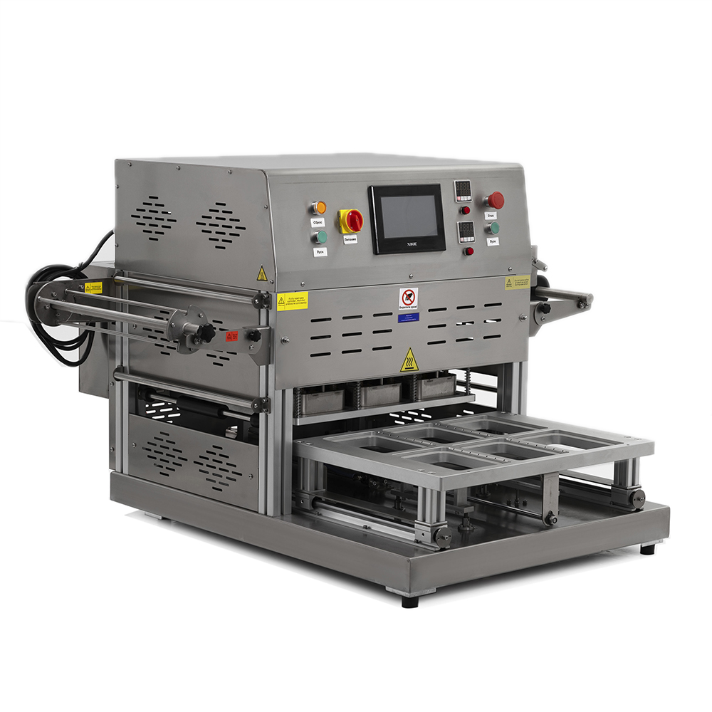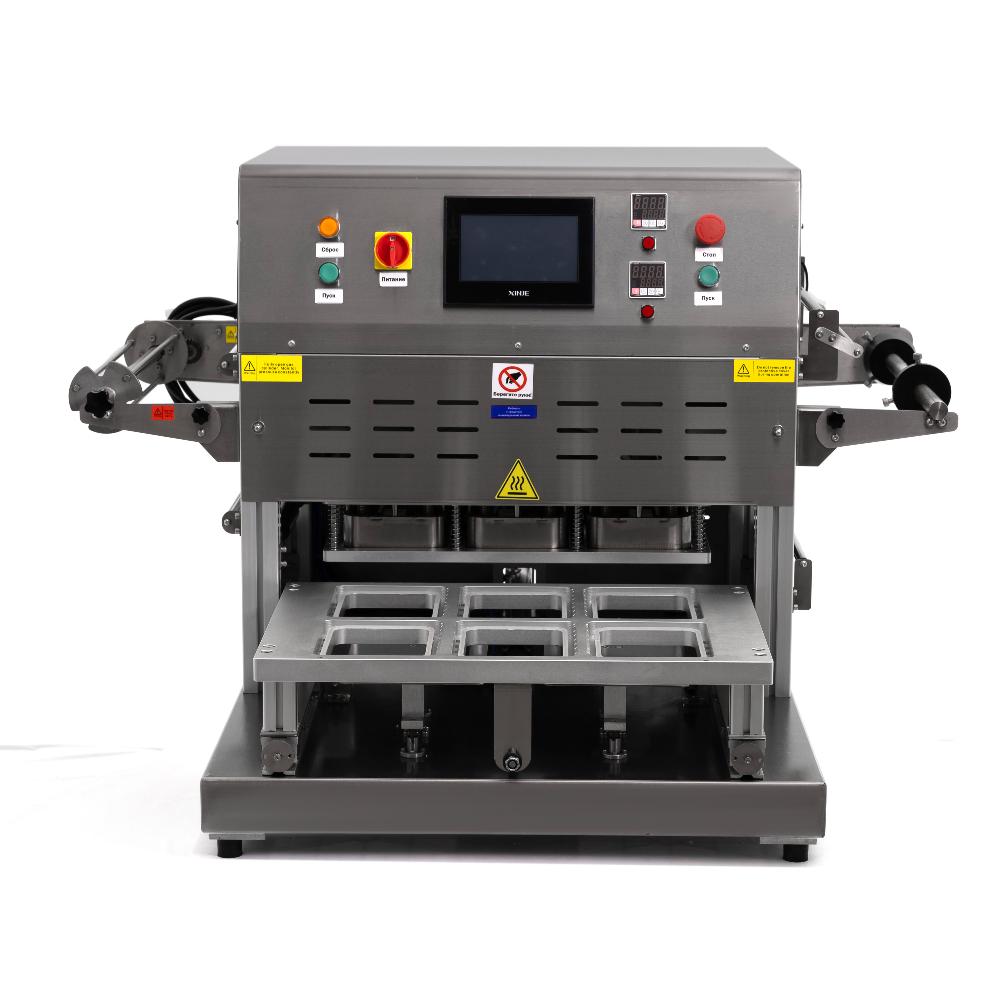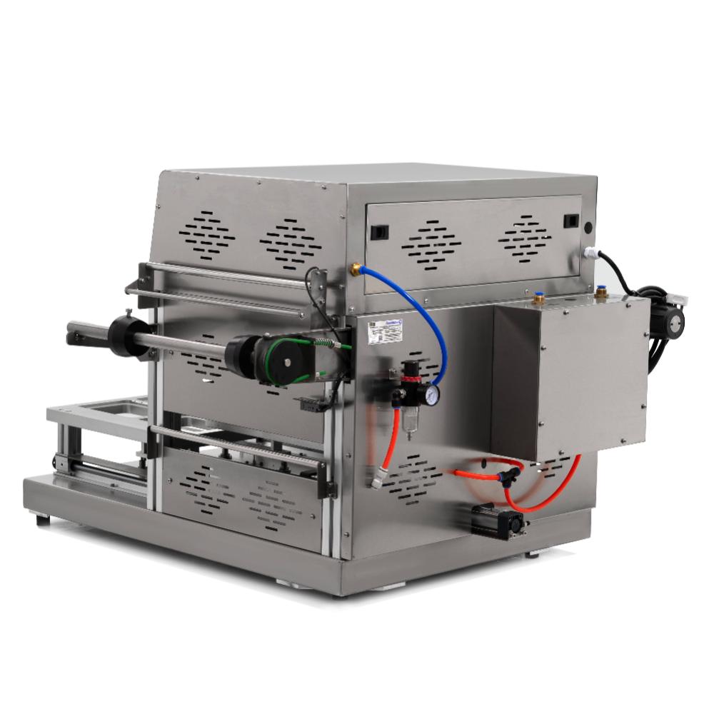 - Эффективная термосварка с обрезкой по контуру – мощный нагревательный элемент (3,5 кВт) гарантирует равномерный прогрев и герметичное соединение многослойной пленки с бортом лотка по всей площади контакта. Встроенный механизм одновременно обрезает излишки пленки точно по контуру изделия, формируя эстетичный товарный вид конечной упаковки.