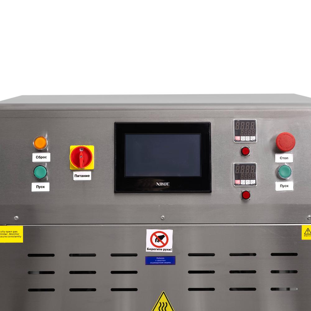 - Комбинированная технология вакуумной газации – оборудование оснащено вакуумным насосом (производительностью 100 м³/ч), который последовательно удаляет воздух из упаковки перед заполнением инертным газом. Это обеспечивает максимальную защиту от окисления, подавляет рост бактерий и значительно увеличивает срок хранения продуктов.