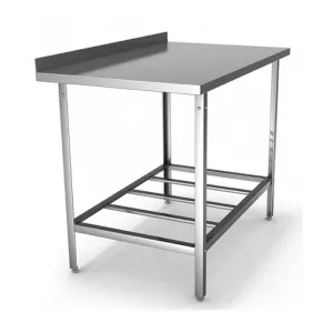 Сборно-разборная конструкция, столешница выполнена из нержавеющей стали AISI 430 и усилена ЛДСП, полка-решетка для хранения различной кухонной утвари, ножки стола снабжены регуляторами высоты, что позволяет устранять неровности пола