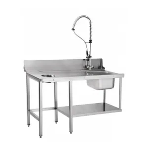 имеет отверстие для сбора крупных отходов, цельнотянутую ванну для предварительного ополаскивания посуды (400х400х300 мм), душирующее устройство для холодной и горячей воды, регулируемые по высоте ножки. Крепление к посудомоечной машине осуществляется с помощью верхнего зацепа и нижних винтов. Путем несложного монтажа стол можно установить как в левом, так и правом исполнении.