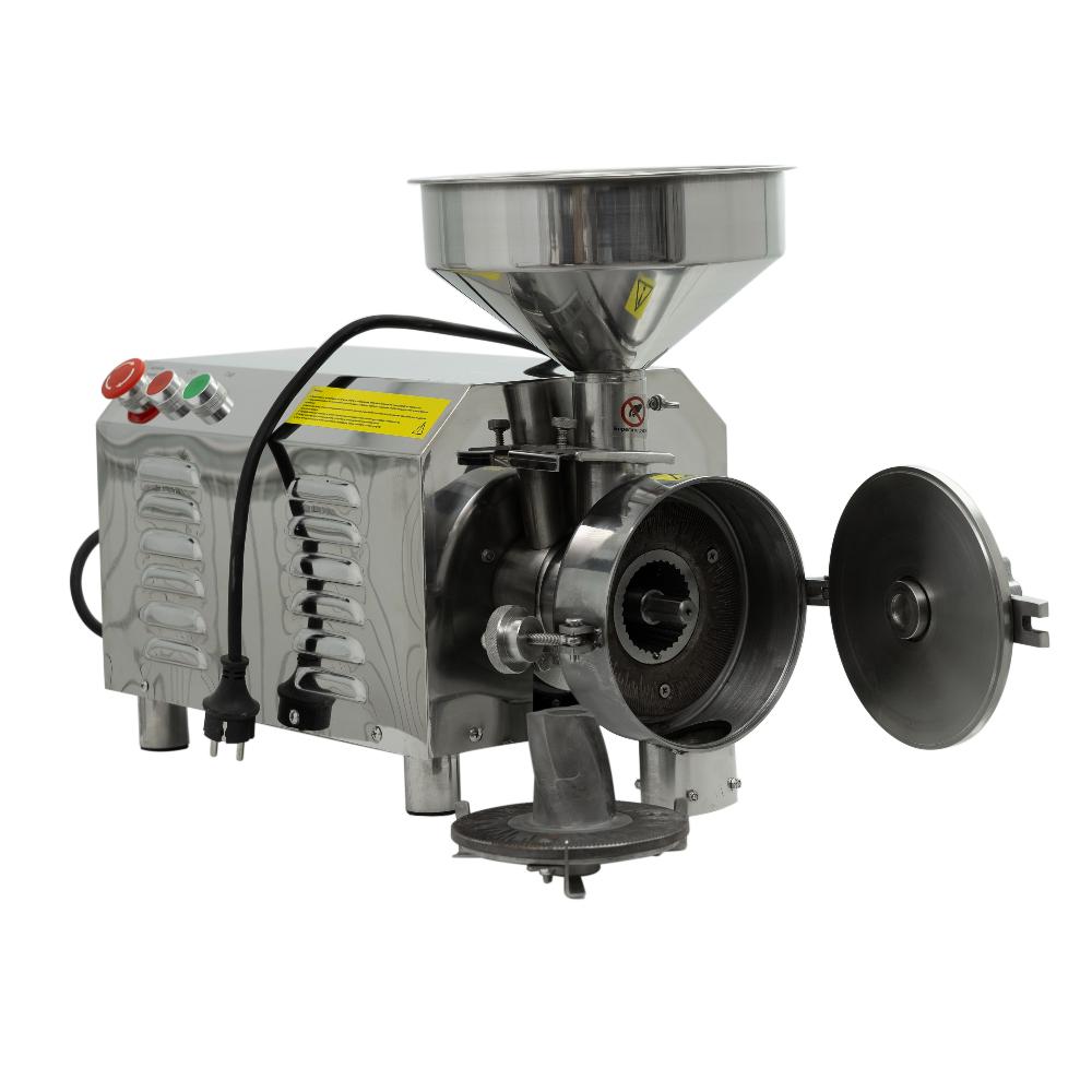 – это профессиональное оборудование для тонкого помола сухих сыпучих продуктов с влажностью не более 35%: пшеницы, ржи, кукурузы, гречки, риса, гороха, нута, сои, кофе, специй, сушёных ягод и других зерновых культур. Модель предназначена для использования на предприятиях пищевой промышленности, в пекарнях, ресторанах и цехах общественного питания. Мощный двигатель 2200 Вт и чугунные жернова обеспечивают производительность до 30–50 кг/ч, а получаемая мука соответствует всем стандартам качества и подходит для выпечки хлеба и хлебобулочных изделий. Корпус и приёмный бункер выполнены из нержавеющей стали с применением технологий хромирования и окрашивания, что гарантирует гигиеничность и долговечность даже при интенсивной эксплуатации.